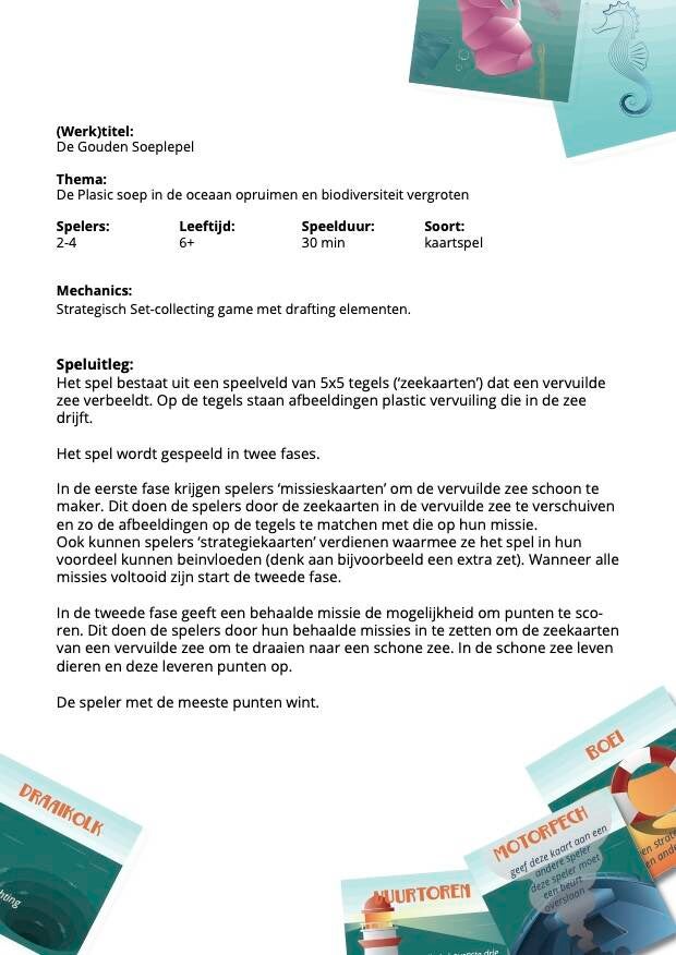 Is een familie spel wat ik samen met twee vrienden, Anna Steijger en Hilko van Idsinga heb bedacht en ontworpen. Een spel waarbij het doel is om de zee vrij te maken van plastic afval, De plastic soep. Je kruipt daarom in de huid van een milieubeschermer en gaat op missie om dat plastic op te ruimen. Degene die het meeste afval weet te verwijderen en daarmee de biodiversiteit weet te vergroten wint de GOUDEN SOEPLEPEL!